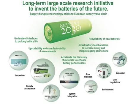 Part I:“電池2030+(BATTERY 2030+)”背景《電池2030+(BATTERY2030+)》是一項大規(guī)模的歐洲長期研究計劃,為歐盟委員會提出的戰(zhàn)略能源技術(shù)計劃(SET-plan)的想法之一,旨在聯(lián)合歐洲整體解決未來電池研發(fā)過程中所面臨的各項挑戰(zhàn),克服重重阻力達(dá)成宏大的既定的電池性能目標(biāo)。研究內(nèi)容以“化學(xué)中性途徑(chemistry neutral approach)”為導(dǎo)向,基于現(xiàn)有或未來多種不同類型的電池化學(xué)物質(zhì),通過縮小各自之間的差距來發(fā)揮其全部潛力以實現(xiàn)電池的實際能力和理論極限。理念上基于給歐洲電池企業(yè)乃至全球電池企業(yè)的價值鏈提供新的發(fā)展和支持,比如從原材料到先進(jìn)材料的發(fā)展,到電池和電池包的設(shè)計制造,電池壽命終止后的回收利用和電池實際應(yīng)用場景等。除此之外,《電池2030+》的長期發(fā)展路線圖也充分地彌補(bǔ)了歐洲電池內(nèi)部的中期研究和創(chuàng)新工作–歐洲技術(shù)和創(chuàng)新平臺(ETIP)。因此,歐盟希望借助于《電池2030+》來推動歐洲為期10年的大規(guī)模努力以促進(jìn)電池領(lǐng)域的變革性發(fā)展。不斷提出新的研究方法和開拓新的創(chuàng)新領(lǐng)域,實現(xiàn)安全的超高性能電池開發(fā),最終實現(xiàn)歐洲社會2050年前不再使用化石能源(如圖1所示)。2019年3月,歐盟啟動《電池2030+》協(xié)調(diào)和支持行動,以確定計劃的研發(fā)路線圖。本次發(fā)布的《電池2030+》研發(fā)路線圖第二版草案經(jīng)討論修改后,將于2020年2月底提交給歐盟委員會。 圖1. 《電池2030+》的長期愿景及使命 Part II:“電池2030+”計劃目標(biāo)《電池2030+》的總體目標(biāo)是實現(xiàn)具有超高性能和智能化的可持續(xù)電池功能以適用于每個應(yīng)用場景。所謂超高性能,是指能量和功率密度接近理論極限,出色的使用壽命和可靠性,增強(qiáng)安全性,環(huán)境可持續(xù)性和可擴(kuò)展性,以實現(xiàn)具有競爭力成本的大規(guī)模化生產(chǎn)電池。第一個重要挑戰(zhàn)是達(dá)到最 好的電池性能,因此發(fā)現(xiàn)新材料和新化學(xué)體系的開發(fā)過程必須加快。《電池2030+》提出電池界面基因組(BIG)–材料加速平臺(MAP)計劃,將采用人工智能(AI)大幅減少電池材料的開發(fā)周期。第二個重要挑戰(zhàn)是延長單體電池和電池系統(tǒng)的使用壽命和安全性。壽命和安全都對未來電池的大小,成本和接受度具有關(guān)鍵性影響。為了實現(xiàn)第二個挑戰(zhàn),《電池2030+》提出了兩種不同且互補(bǔ)的建議方案:開發(fā)直接在化學(xué)和電化學(xué)反應(yīng)中可探測的傳感器,將新型傳感器嵌入電池中連續(xù)監(jiān)控其“健康”和“安全狀態(tài)”。另一方面,通過使用自愈合功能來提高電池容量并提高電池性能。與目前最 先進(jìn)的電池技術(shù)相比,《電池2030+》旨在提出并影響電池技術(shù)的未來發(fā)展(如圖2):第一,將電池實際性能(能量密度和功率密度)和理論性能之間的差距減少至少1/2。第二,至少將電池的耐用性和可靠性提高3倍。第三,對于給定的電力組合,將電池的生命周期碳足跡減少至少1/5。第四,使電池的回收率達(dá)到至少75%,并實現(xiàn)關(guān)鍵的原材料回收率接近100%。 圖2.《電池2030+》對未來電化學(xué)存儲系統(tǒng)的最 新技術(shù)展望 Part III:“電池2030+”主要研發(fā)方向3.1 材料加速平臺(Materials Acceleration Platform,MAP)從能源技術(shù)的生產(chǎn),存儲到最終交付使用,材料的發(fā)現(xiàn)和開發(fā)始終貫穿于整個過程。特別對于新興的電池技術(shù),先進(jìn)材料幾乎是所有清潔能源創(chuàng)新的基礎(chǔ)。若依靠現(xiàn)有的傳統(tǒng)重復(fù)性試驗開發(fā)過程,需要耗費(fèi)大量的時間,人力物力去開發(fā)新型高性能電池材料并用于電池設(shè)計,這一過程從最初發(fā)現(xiàn)到完全實現(xiàn)商業(yè)化可能長達(dá)10年之久。因此,在《電池2030+》項目中,為了加速超高性能的,可持續(xù)發(fā)展的智能型電池開發(fā),計劃在歐洲范圍內(nèi)設(shè)立電池“材料加速平臺(MAP)”,并與電池界面基因組(BatteryInterface Genome,BIG)集成在一起。同時BIG-MAP基礎(chǔ)設(shè)施模塊化設(shè)置,全系統(tǒng)具有高度的通用性,以便能夠容納所有新興的電池化學(xué)體系,材料成分,結(jié)構(gòu)和界面。另一方面,MAP將利用人工智能(AI)從許多互補(bǔ)的方法和技術(shù)中集成和編排數(shù)據(jù),整合計算材料設(shè)計,模塊化和自主性綜合機(jī)器人技術(shù)和先進(jìn)表征,實現(xiàn)全新的電池開發(fā)策略。促進(jìn)材料,工藝和設(shè)備的逆向設(shè)計和定制。最終,在MAP框架下由每個核心元素構(gòu)建概念電池,開發(fā)出具有突破性的電池材料,極大提高電池開發(fā)速度和電池性能。圖3. 電池材料加速平臺(MAP)的核心組成部分 (一)MAP重點研發(fā)技術(shù)a. 高通量技術(shù):開發(fā)自主材料合成機(jī)器人,構(gòu)建電池材料自身及使用過程中原位的自動化高通量表征。實現(xiàn)電極活性材料及其組合方式的快速篩選和電解液配方的系統(tǒng)表征。基于高通量數(shù)據(jù)的建模和數(shù)據(jù)生成相結(jié)合,以物理參數(shù)為導(dǎo)向?qū)﹄姵丶捌浠钚圆牧线M(jìn)行分析和表征。b. 建立基于分布式訪問